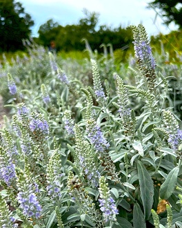 全体に綿毛に覆われ緑白色に見えます。8~9月に茎の先に紫色の花を密に咲かせます。