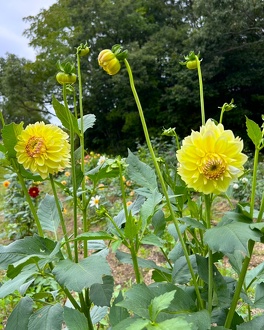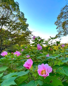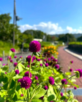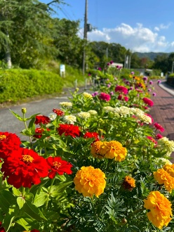 第2・第3駐車場から管理事務所へ向かう道中、交差点のすぐ側にある花壇です。たくさんの蝶が飛び交い、ジニアやセンニチコウ、バタフライピー、ローゼル、ケイトウ、ニチニチソウ等々、夏から秋への花々が元気いっぱいです。