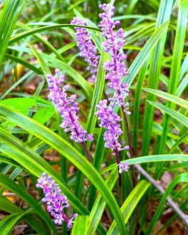 常緑性の多年草で、日なた・日陰を選ばず育つ丈夫な性質です。暑さや寒さにも強く、現在あじさい園では、長い穂を伸ばして、青紫から白色の花を咲かせています。花が終わると黒い実がなるのも特徴です。