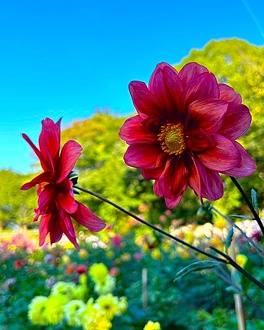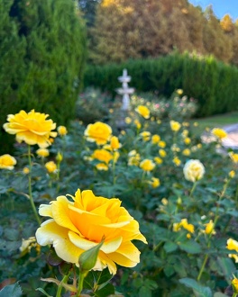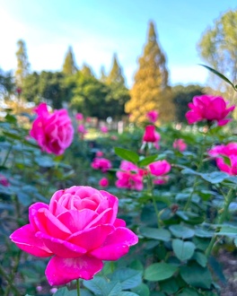 バラ園では秋のバラが少しずつ咲き始めました。澄んだ空と紅葉の木々に囲まれ、ひときわ綺麗な花をぜひご覧ください。
