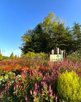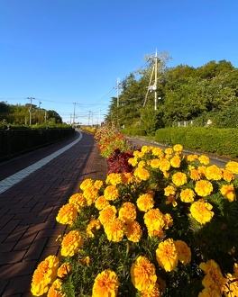 第2・第3駐車場から管理事務所へ向かう道中、交差点のすぐ側から続く花壇です。たくさんの蝶が飛び交い、ジニアやセンニチコウ、アジアンガーデン、マリーゴールド、バタフライピー、ローゼル、ケイトウ、ニチニチソウ等々、、、、