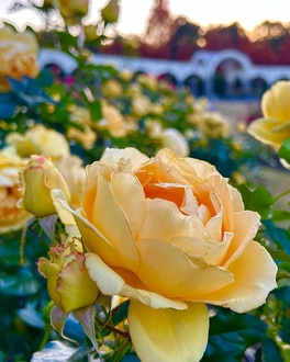 【ユリイカ】黄色ともオレンジ色とも、アプリコットとも言えそうな美しい色合いが魅力のバラです。フリルのかかった花びらが華やかさを増します。