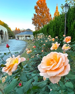 バラ園では秋のバラが咲き始めました。澄んだ空と紅葉の木々に囲まれ、ひときわ綺麗な花をぜひご覧ください。