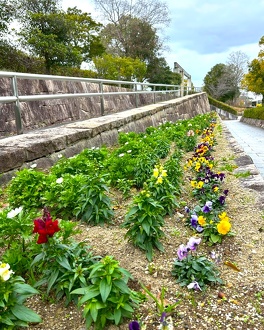 第2・第3駐車場から管理事務所へ向かう道中、交差点のすぐ側にある花壇や、スポーツハウス周りの花壇は、明るくカラフルで元気が出る色合いのパンジーやビオラ、キンギョソウ、ノースポール等が咲き、ご来園される方をお迎えしています。