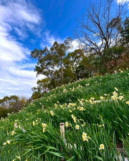 当園水仙郷では60,000株以上のスイセンが斜面一面に咲き、素敵な香りを漂わせます。