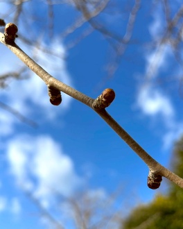 寒い冬をじっと耐えているイチョウの枝から冬芽を発見しました。植物はもう春の準備が始まっているようです。
